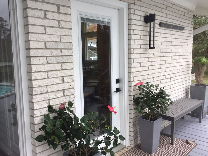 Long, winding sidewalk from driveway to front door, and long sidewalk from port cochere almost to boat dock.